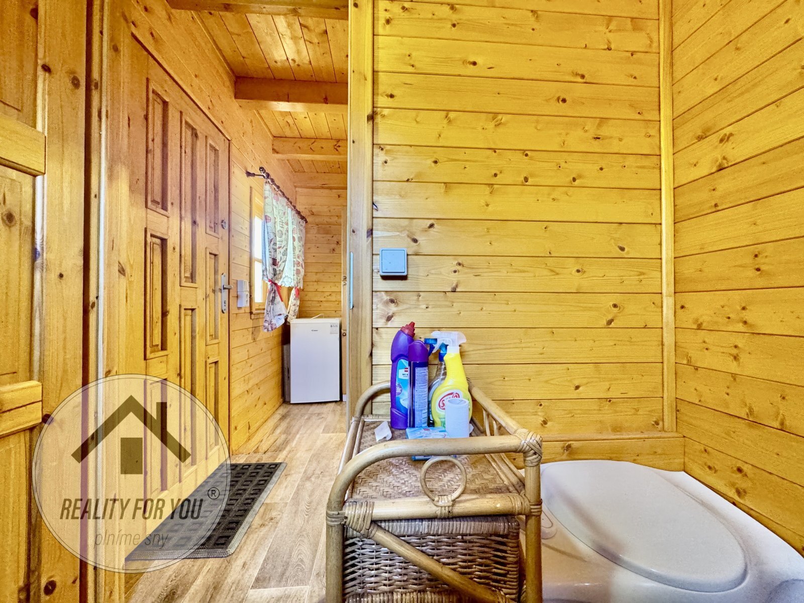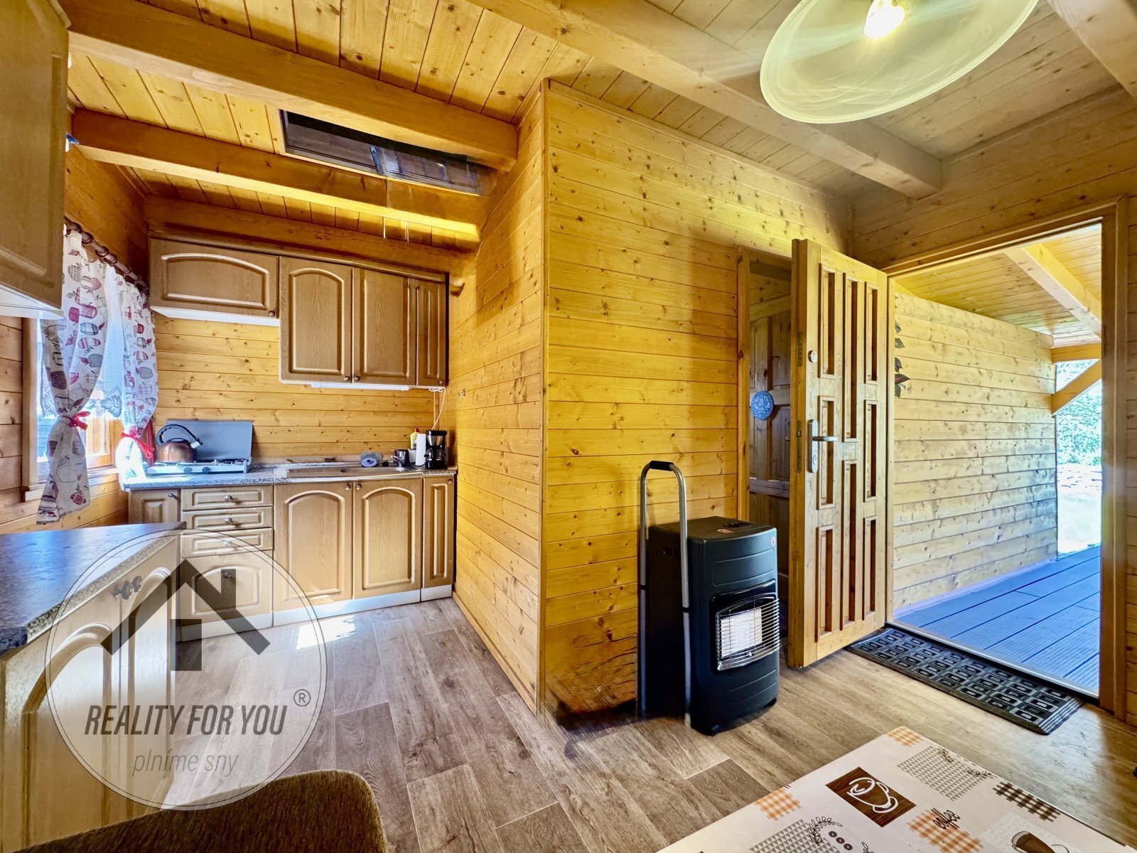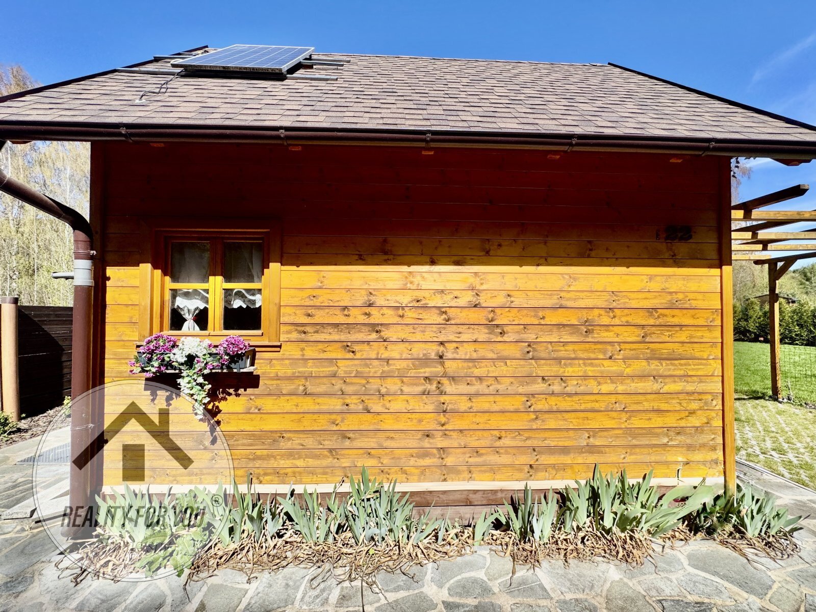 Elektřina je řešena solárním panelem s. centrálním rozvodem v celé chatce. Zabezpečovací systém uvnitř stavby je samozřejmostí.