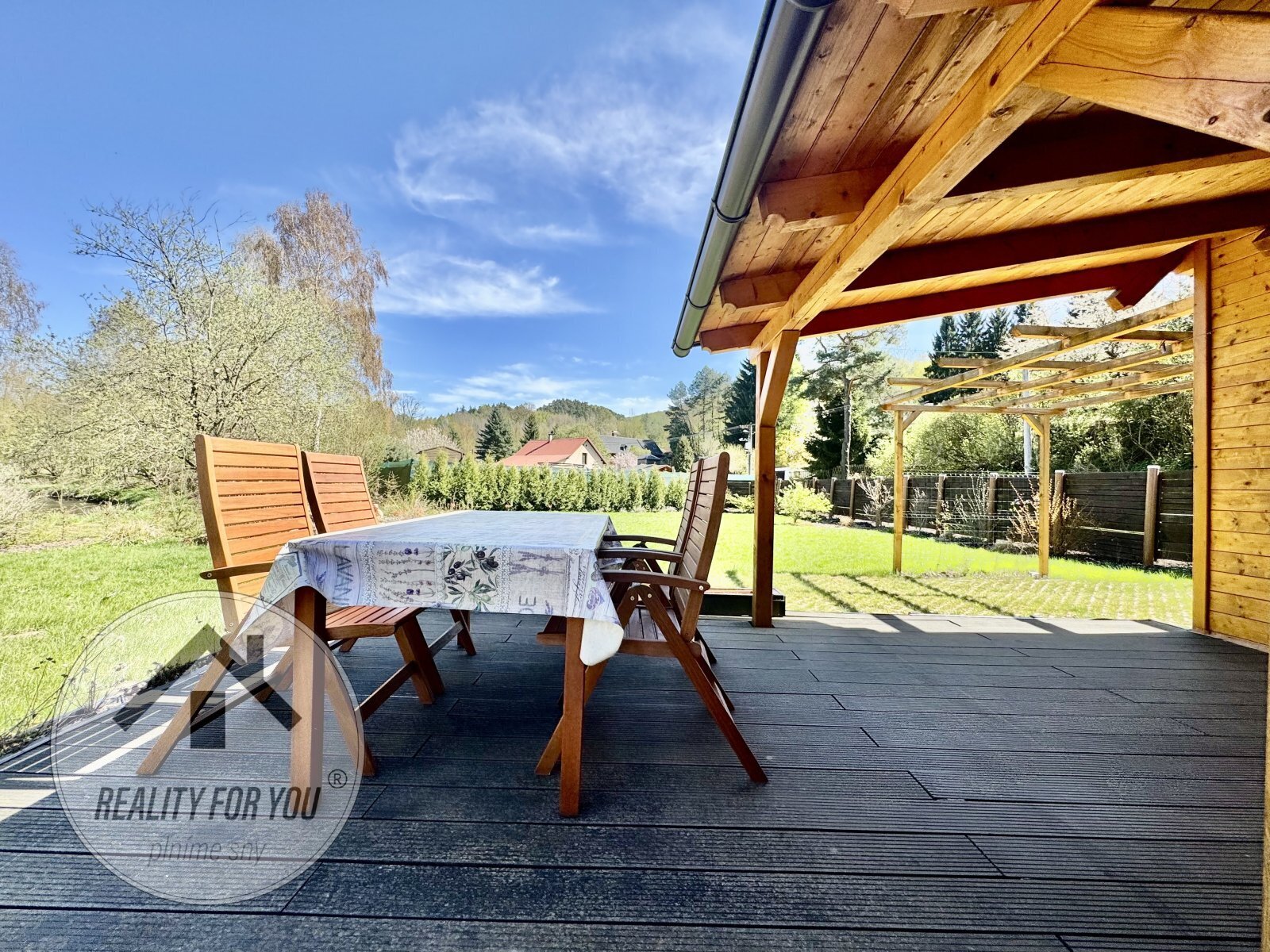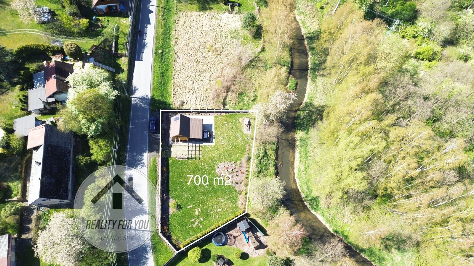 Pozemek o celkové výměře 700 m2 je rovinatý a téměř celý oplocený. Zadní část zahrady sousedí s řekou Ploučnice a majitel nechal tuto část otevřenou. Zahrada nabízí absolutní soukromí, příjemné výhledy do zeleně a možnost parkování přímo na pozemku.