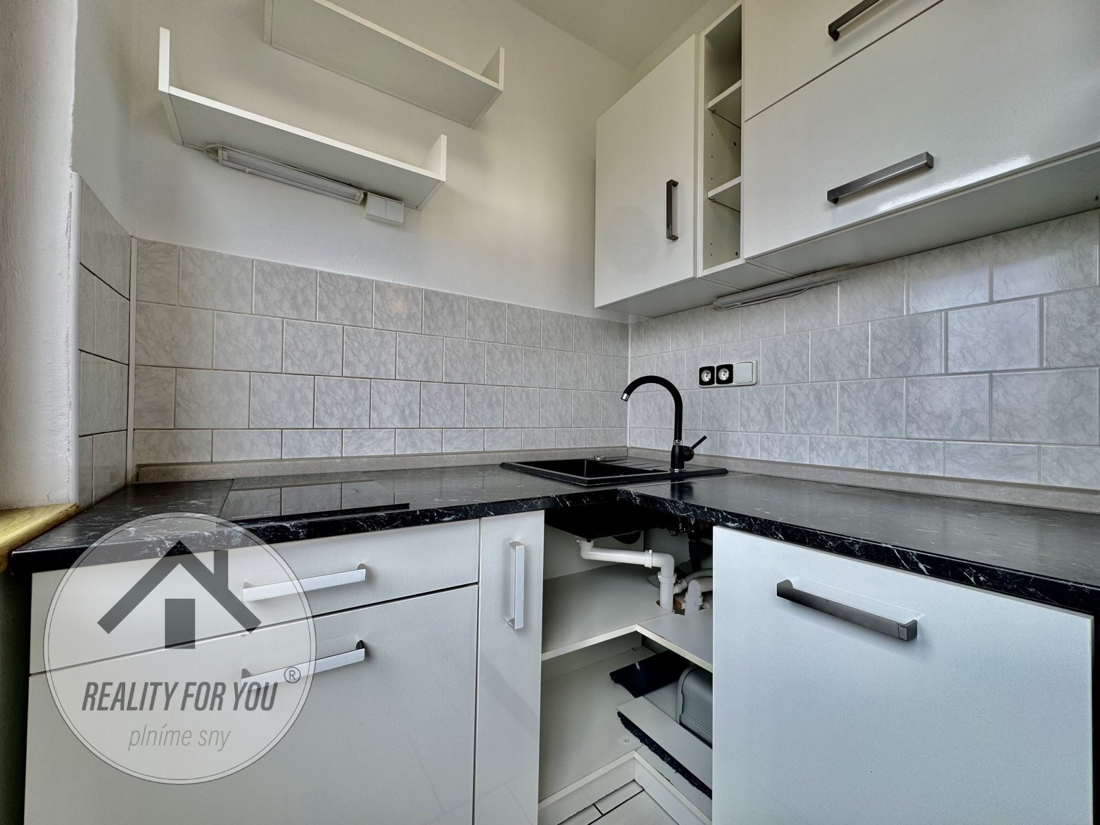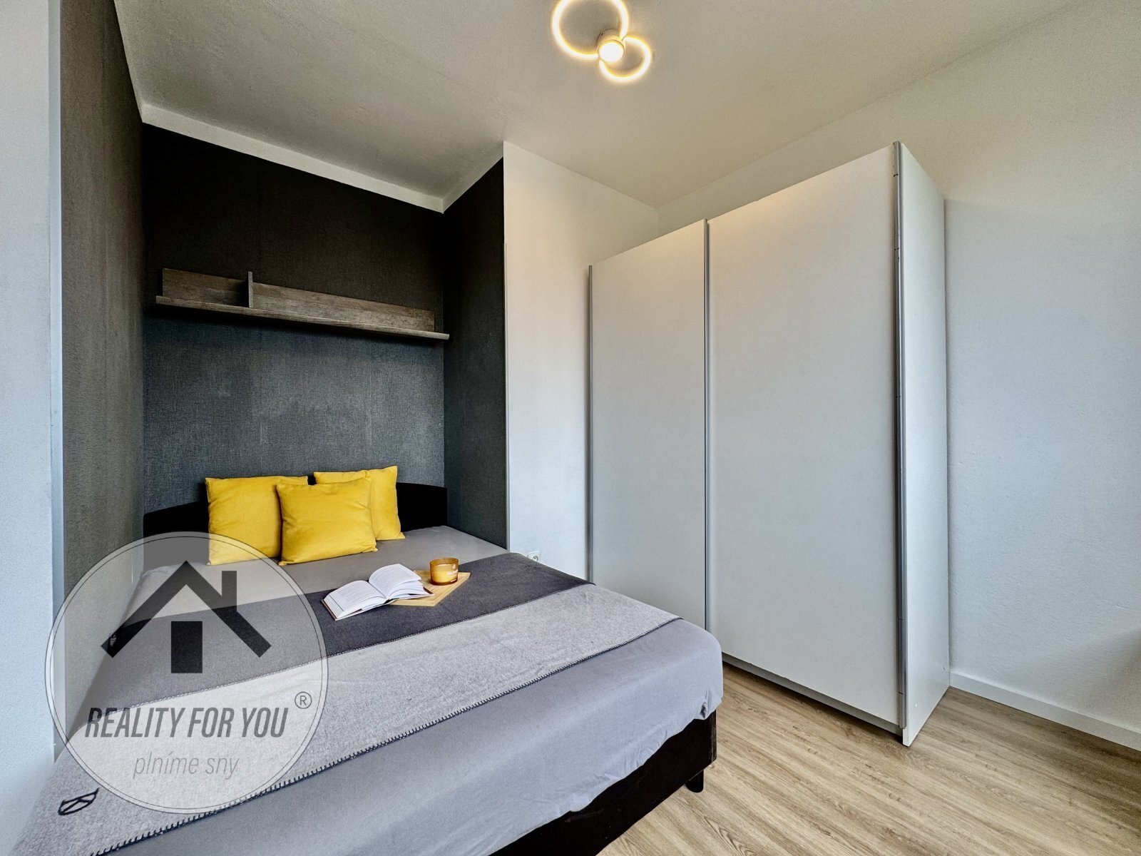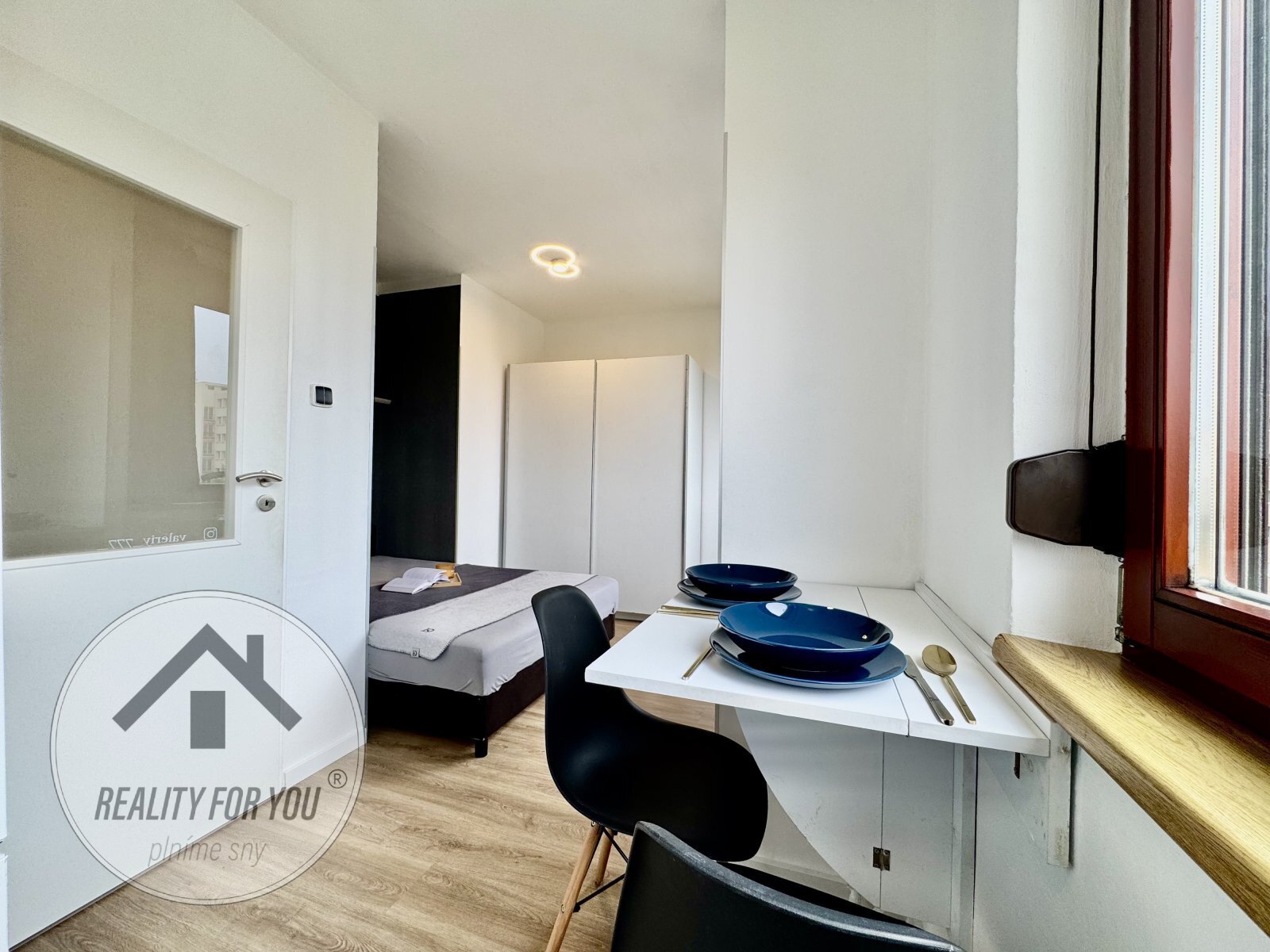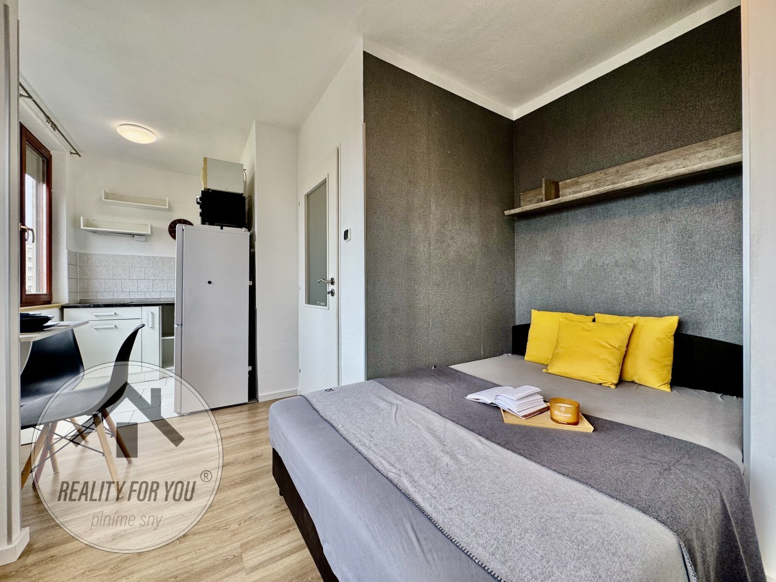 Kuchyňská linka s vestavěnou myčkou, s dostatkem úložného a přípravného prostoru. Obytná část je šikovně řešena s prostorem pro postel, šatní skříň i psací stůl.