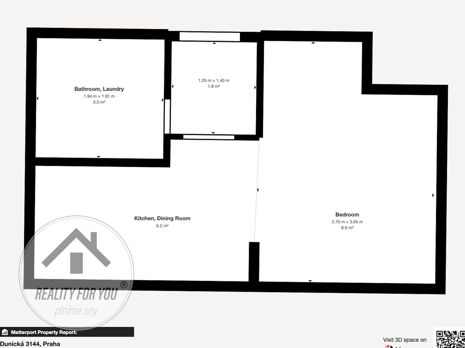 Byt nabízí obytnou část (ložnici) s výměrou 8,1 m2, kuchyni (5,2 m2), koupelnu s toaletou (3,1 m2) a předsíň (1,8 m2).