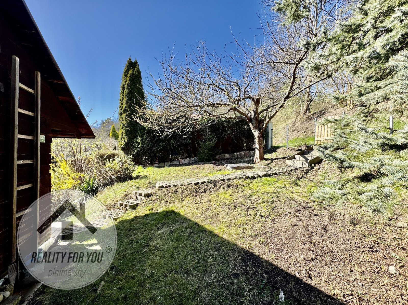 Na zahrádce jsou vzrostlé ovocné stromy: jabloně, švestka nebo třešeň.