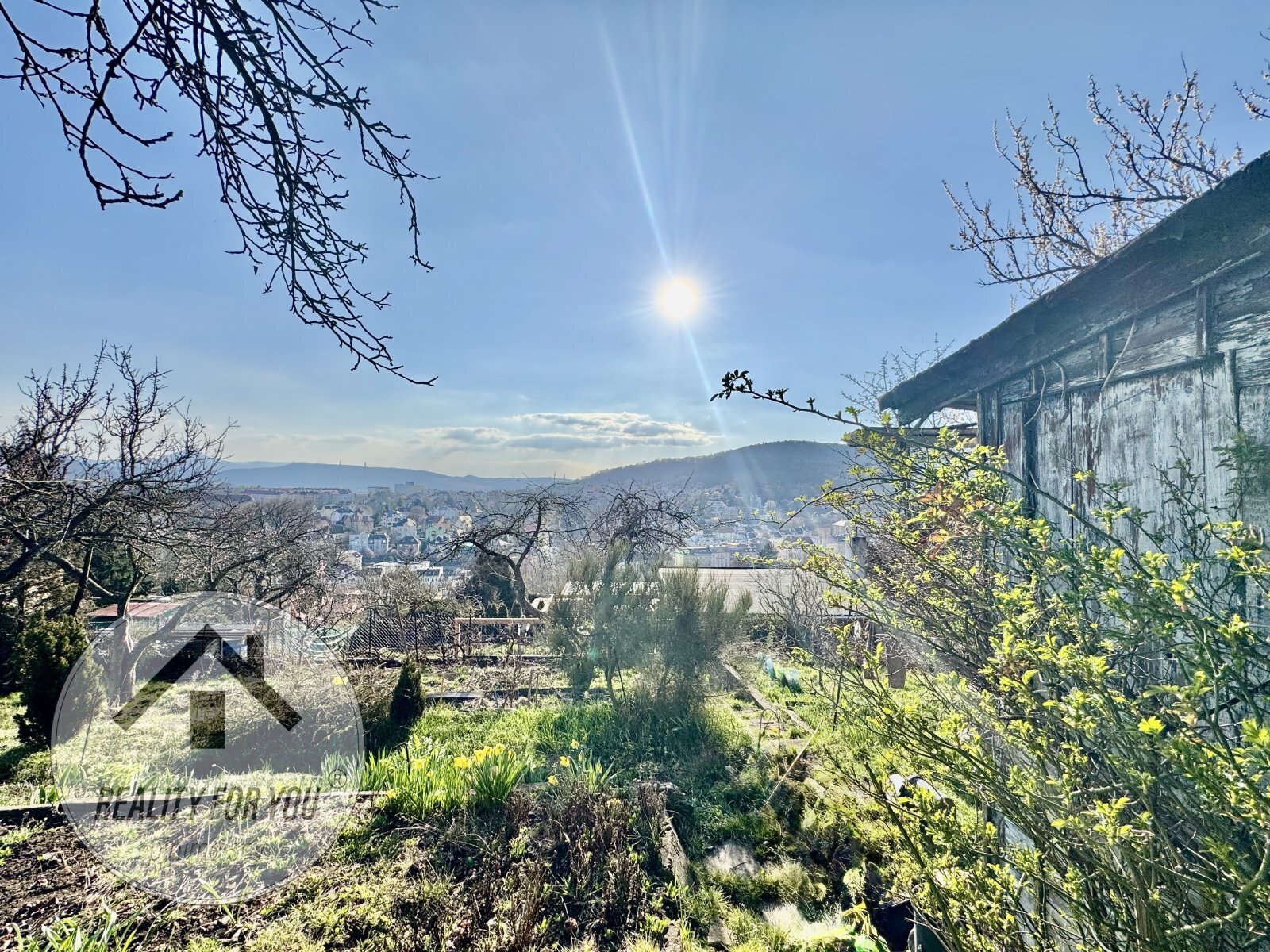 Zahrádka o výměře cca 359 m2 je umístěna v první linii zahrádkářské osady a nabízí krásné výhledy. Je velmi slunná a díky terasám, které na pozemku vznikly i rovinatá.